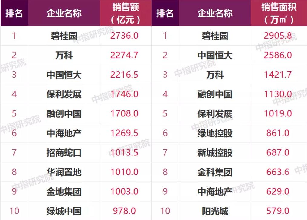 2021年1-4月房企销售业绩TOP10 数据来源:中指研究院
