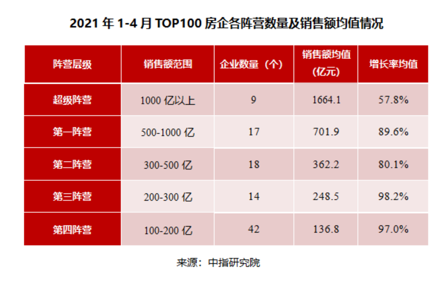 据中指研究院数据,1-4月,TOP100门槛值为110亿元,同比增长了109.5%。各阵营房企门槛也在不断抬高:TOP3房企门槛值较上年增长19.2%达2216.5亿元;TOP10房企门槛值为978.0亿元,较上年增长69.2%;TOP30房企门槛值为410.7亿元,较上年增长74.6%;TOP50门槛则同比增长了89.4%。