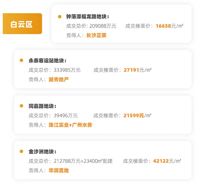 在住宅供地方面,4月26日至27日,白云区集中出让居住地块7宗,居中心六区排名前列,总出让建筑面积120.8万平方米,总成交金额达163亿元。