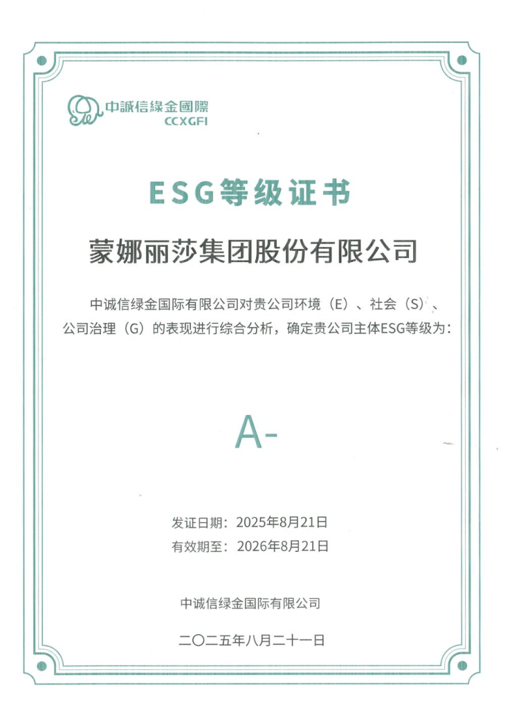 2025年8月,蒙娜丽莎集团(股票代码:002918)凭借在环境、社会及公司治理(ESG)领域的系统性实践,斩获中诚信绿金国际有限公司(以下简称 “中诚信绿金”)最新发布的ESG评级“A-”等级。
