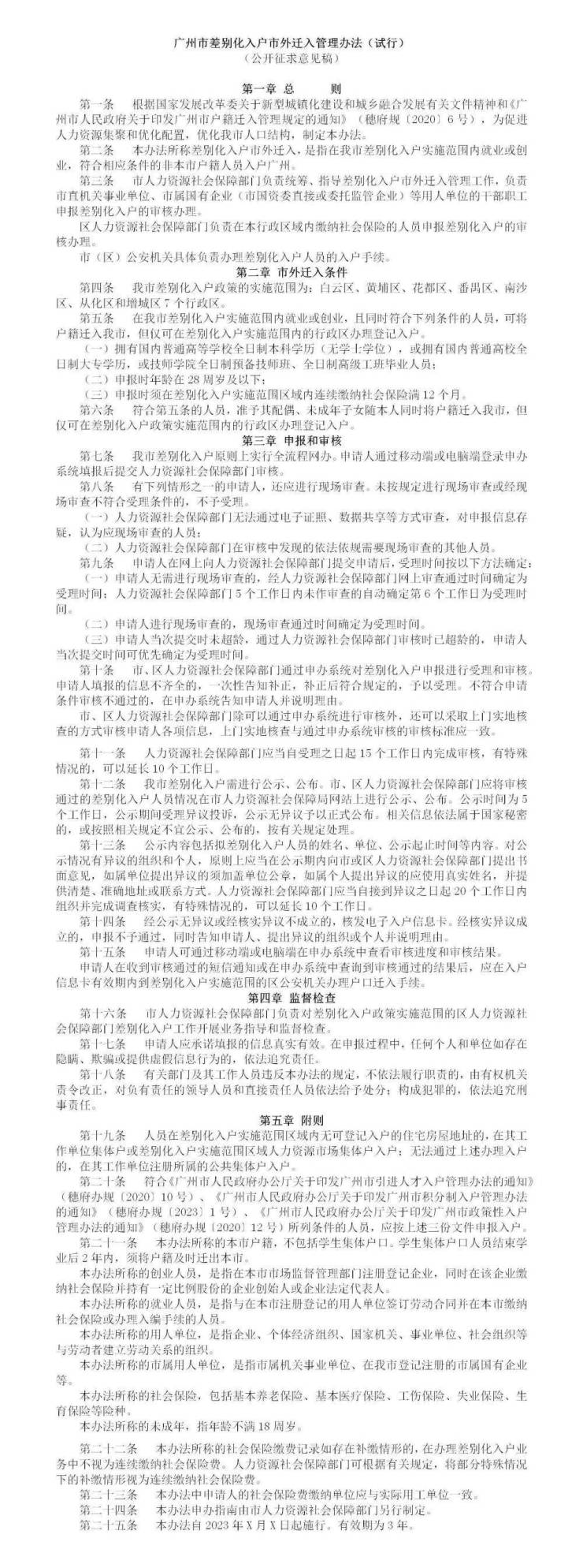 近日,广州市人力资源和社会保障局官网发布关于公开征求《广州市差别化入户市外迁入管理办法》(下简称《办法》)意见的通告,指出28周岁以下,大专学历等,连缴社保满一年者可入户广州白云、黄埔、花都、番禺、南沙、从化和增城7个行政区。
