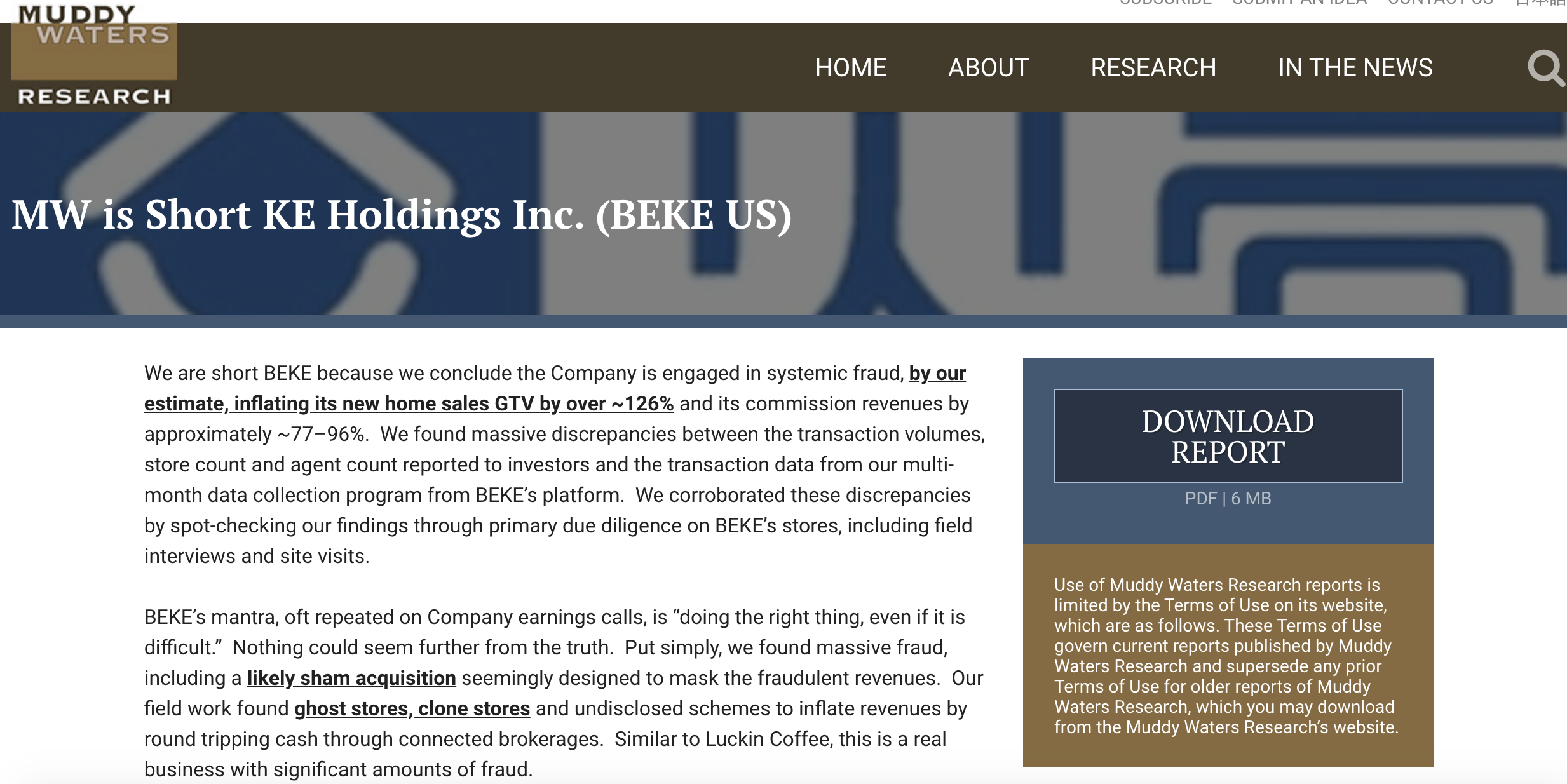 12月16日晚间,浑水调研公司(Muddy Waters Research)在其官网发布了一篇报告,该机构做空居住服务平台排名前列股贝壳找房(NYSE:BEKE)。