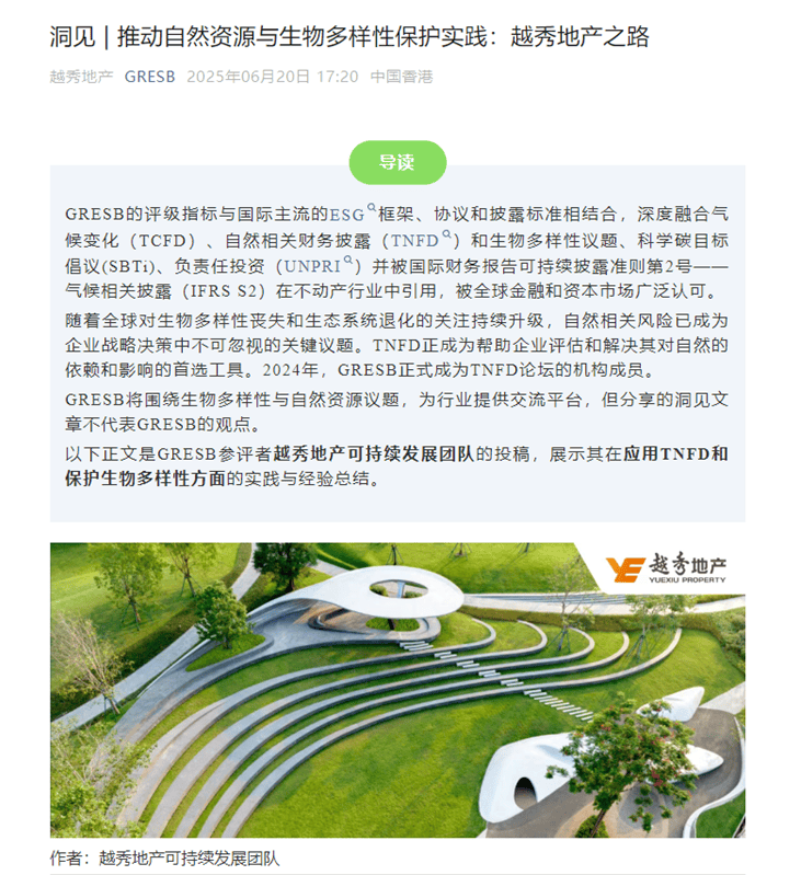 近日,越秀观樾的月亮湖生态修复案例成功入选国际知名ESG评级机构GRESB(全球房地产可持续评估体系)洞见案例,这是越秀地产可持续发展案例首次在国际专业机构的官方渠道进行分享。