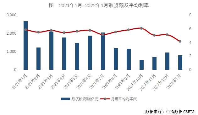 据中指研究院监测,2022年1月房地产企业融资总额为792.2亿元,同比下降70.3%,环比下降16.6%,单月融资规模同比连续11个月下降。行业平均利率为4.13%,同比下降1.72个百分点,较上月下降0.99个百分点。