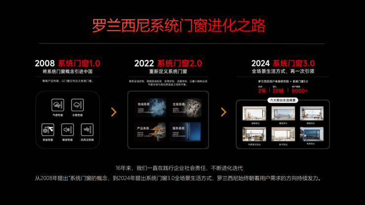 总结:纵观熊志斌对行业与企业发展的布局,不难发现“务实”与“坚守”是核心关键词。面对行业周期波动,他以谨慎乐观的态度带领罗兰西尼修炼内功;秉持“做门窗行业老实人”的初心,从产品、服务到品牌传播,始终以消费者需求为核心;通过持续的产品创新与清晰的市场规划,在行业调整期稳步前行。熊志斌坚信,门窗行业必将在经历市场调整后迎来新的发展机遇,实现更加健康、可持续的发展。