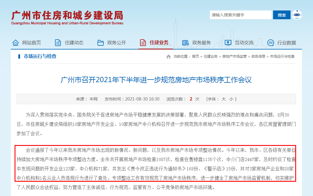 8月30日,广州市住房和城乡建设局组织10家房地产开发企业、10家房地产中介机构,召开进一步规范房地产市场秩序工作会议,各区房屋管理部门参加会议,通报今年以来广州市房地产市场出现的新情况、新问题,以及房地产市场专项整治情况。