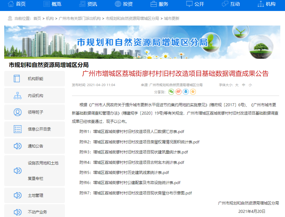 市规划和自然资源局增城区分局发布了《增城区荔城街廖村村旧村改造项目基础数据调查成果公告》。