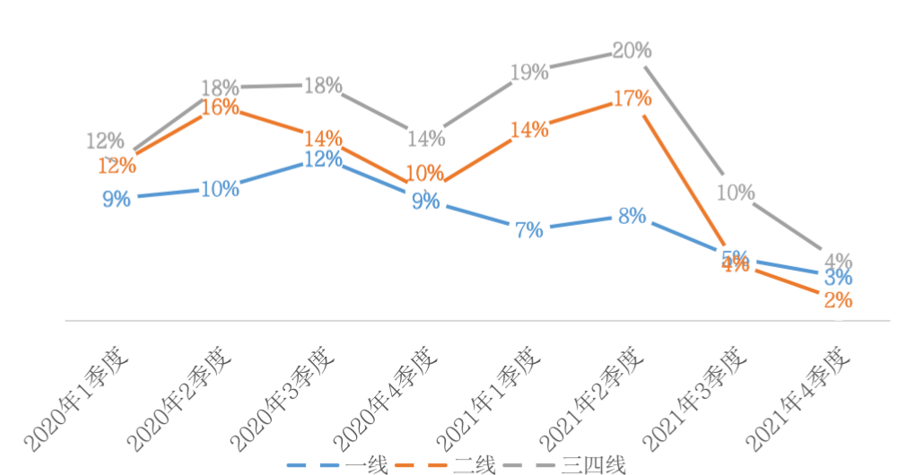 图:2020年-2021年一、二和三四线土地成交溢价率季度趋势(单位:%)