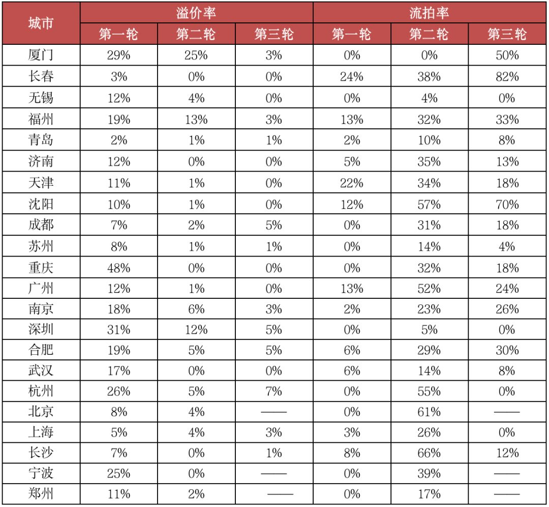 从溢价率来看,在政策严控下,10个城市溢价率均较首轮大幅下降,其中福州、深圳、厦门等第二轮溢价较高的城市,在第三轮溢价下滑至5%左右,三轮溢价率呈现梯队式下滑。而广州、无锡第三轮含宅地块均为底价成交,与首轮12%的溢价率形成鲜明对比。