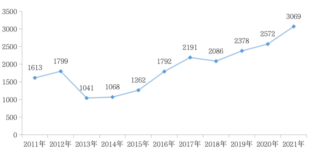 图:2011年-2021年全国300城土地成交楼板价走势(单位:元/平方米)