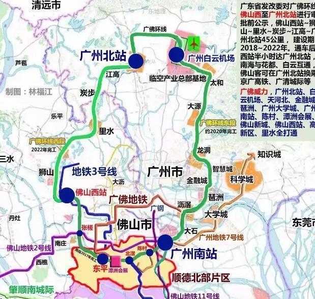 广佛环线佛山西站至广州北站段,自佛山西站城际场西咽喉引出向北,经狮山、里水、炭步、江高,止于广州北站城际场,线路全长约45公里。未来佛山西站到广州北站只需要半个小时。
