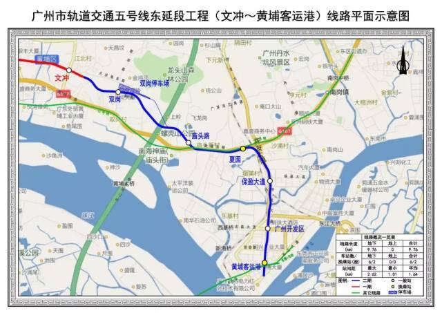 五号线东延段起于五号线的文冲站,终于黄埔客运港站共设6座车站:双岗、庙头路、夏园、保盈大道、广州开发区和黄埔客运港(除已运营车站外,其余站名均为工程暂定名)。