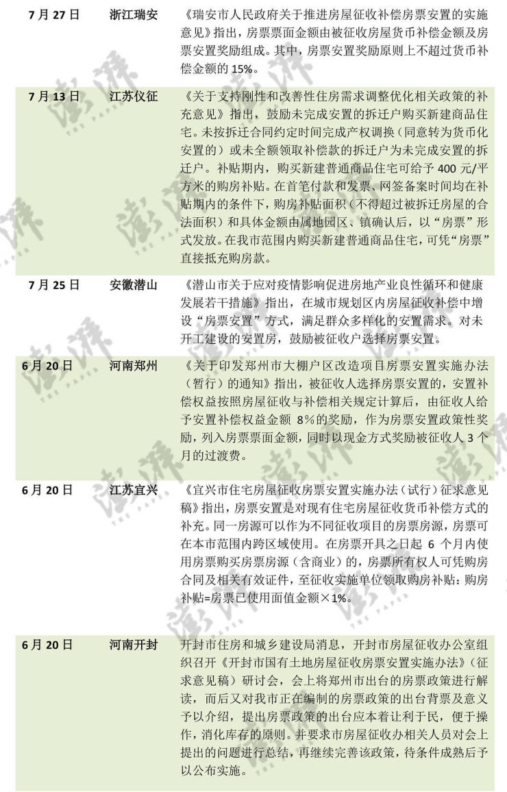 以江苏泰州为例,9月10日,“泰州发布”官方微信公众号发布消息显示,江苏省泰州市住建局等七部门联合印发《关于进一步释放消费潜力持续推进市区房地产市场健康发展的通知》,《通知》称,为进一步激发市场潜在动能,采取试行房屋征收补偿“房票”安置方式、优化土地供应节奏和出让条件、规范房地产经纪行为、推进高品质住宅建设等举措。