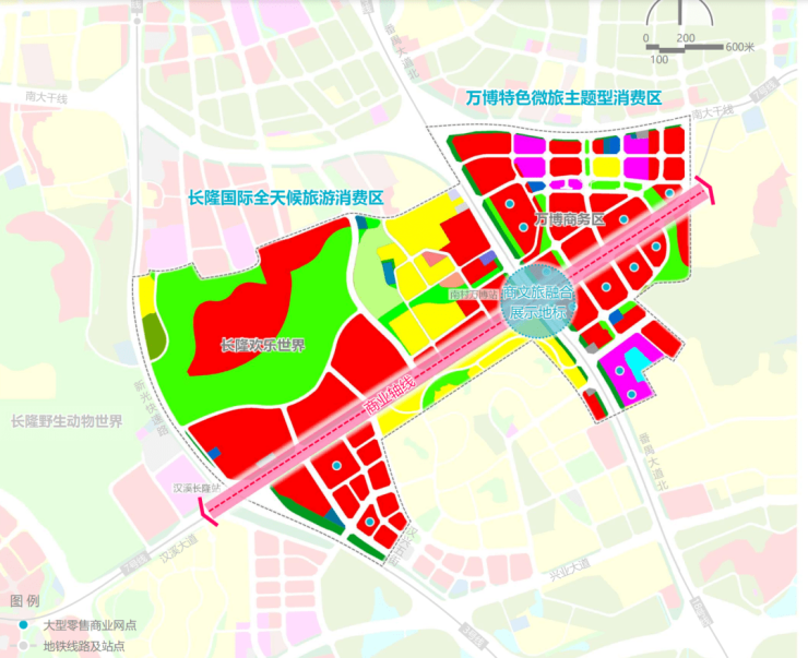 长隆-万博商圈:打造国际文旅及商业微旅高度融合的世界级地标商圈。商圈计划打造“一核一轴两片”的发展结构,“一核”即塑造商文旅融合展示地标,“一轴”即沿汉溪大道打造商业轴线,“两片”即打造长隆国际全天候旅游消费区及万博特色微旅主题型消费区。利用空中、陆地、地下游线串联长隆-万博消费空间。