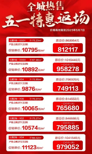 血拼哥查阅资料发现,该促销信息最早应可追溯到5月。“五一”期间,该楼盘曾推出多套特惠房源,单价约1-1.1万/㎡就能拿下。随后,部分特价单位低至9000元+/㎡,甚至是8988元/㎡。