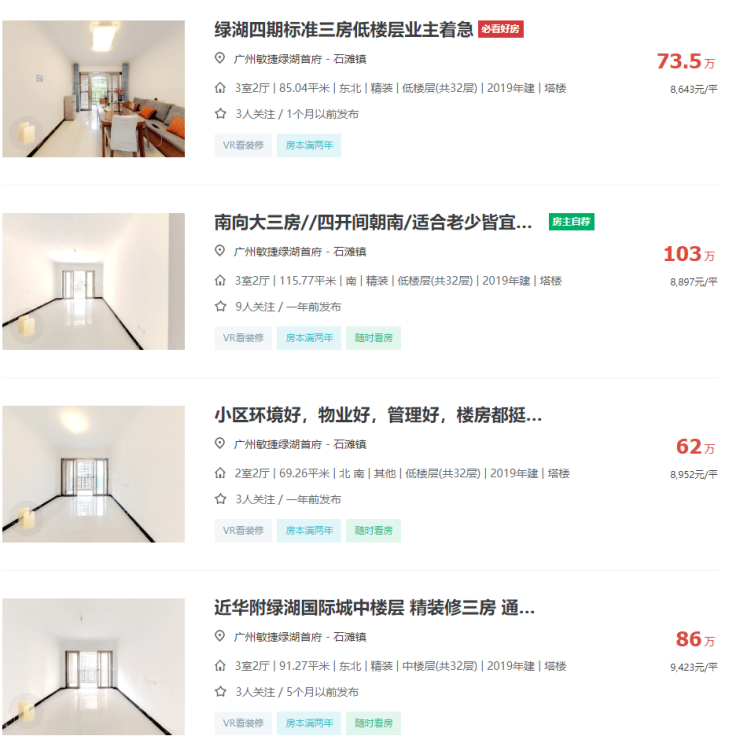据悉,位于增城石滩的敏捷绿湖首府,部分北向,楼层稍差的单位,现建面约78㎡三房,总价低至65万元。也就说,单价仅约9067元/㎡。
