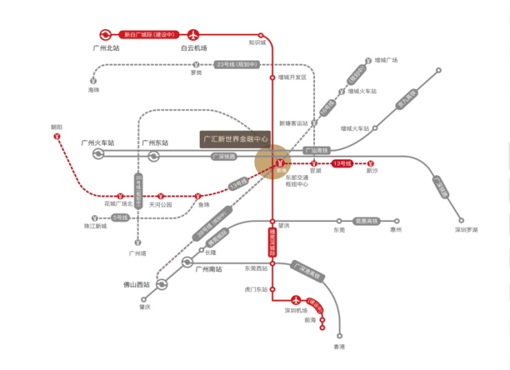 从规划而言,广州东部中心作为大湾区核心城市“穗莞深港” 四城的门户枢纽,汇聚了5地铁+2国铁+2城轨的九大轨道交通,未来可以实现半小时可达广州、东莞主城区,1小时可达深圳主城区。