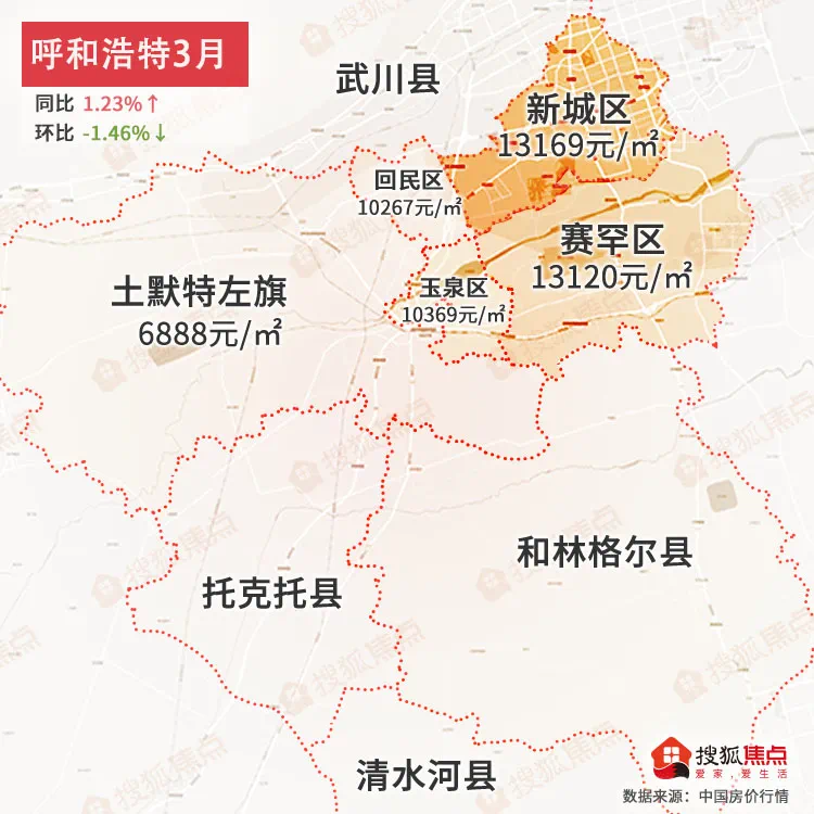呼和浩特3月均价为11816元/㎡同比上涨1.23%↑,环比下跌-1.46%↓