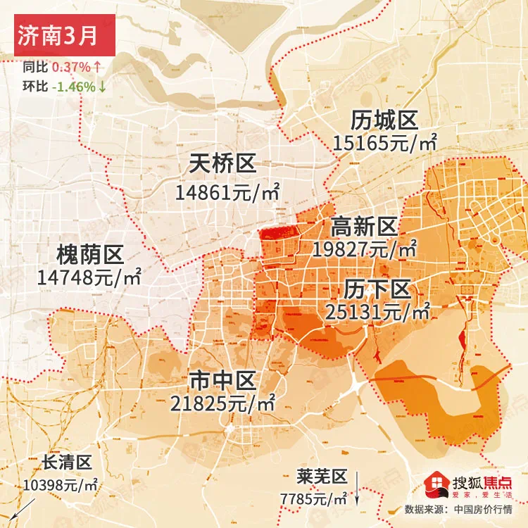 济南3月均价为16314元/㎡同比上涨0.37%↑,环比下降-4.48%↓