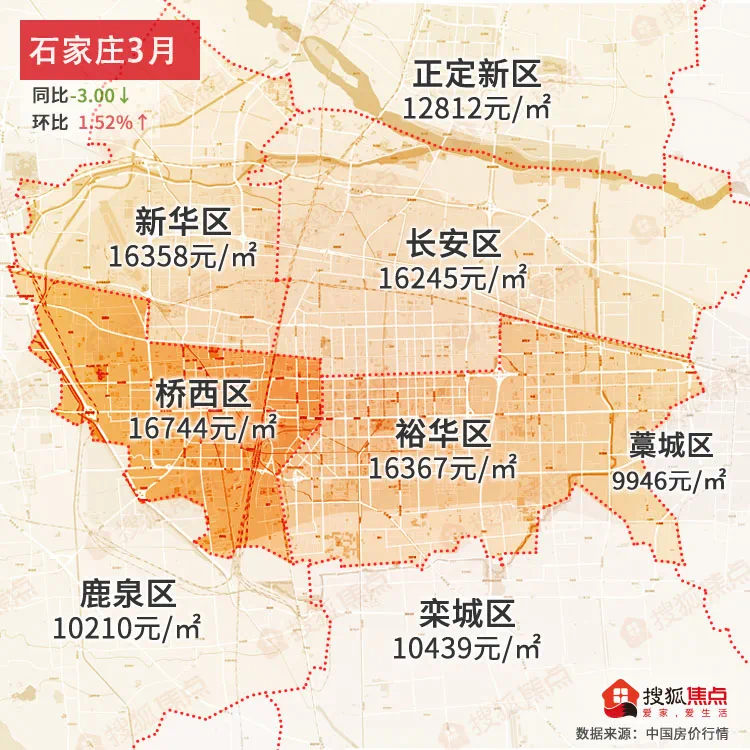 石家庄3月均价为14633元/㎡同比下跌-3.00%↓,环比上涨1.52%↑