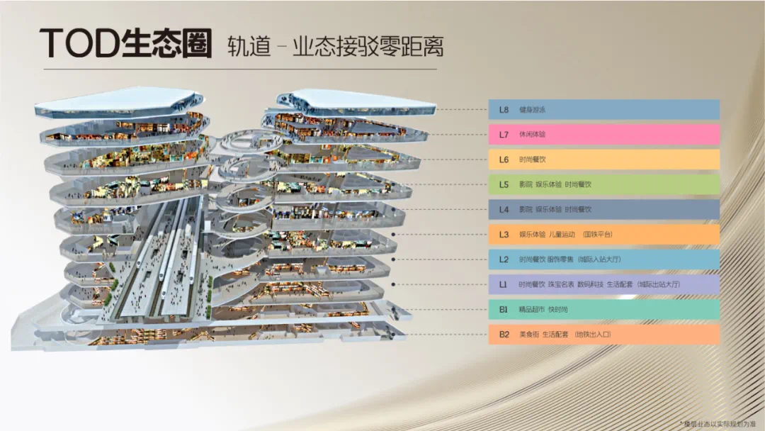 项目商业面积约11万平方米,规划10大商业楼层,全方位打造具有场景体验感、业态创新力和运营活力度的“TOD环游购物公园”。 业态分布如下: