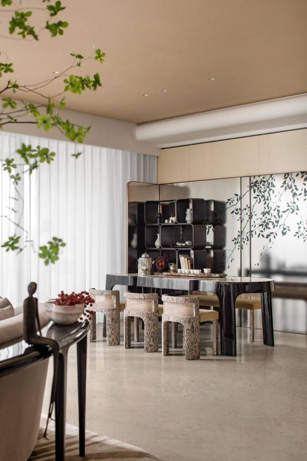 创意板房围绕“人”展开,以私宅理念打造了一个有温度的家,提供了多元弹性洄游空间的生活场景,像美术馆一样留白,又不失“烟火气”。室内使用了皇家白玉、秀翡翠、烟雨蓝、银线米黄、西班牙火山岩等大量奢石,让整个空间显得既开阔又充满艺术感,低调奢华但不冷峻、大气而又温馨。