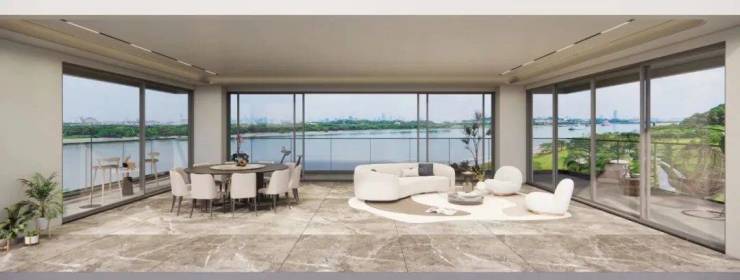 “单户最大面积可达345平,三面屏观江,豪华行政化套房是其独一无二的特点,放眼整个广州市场,能与之匹敌的户型屈指可数。268平同样做到突破性的升级,LDKB一体化,客厅开间宽达7.1米,观江面更是宽达18.6米。”