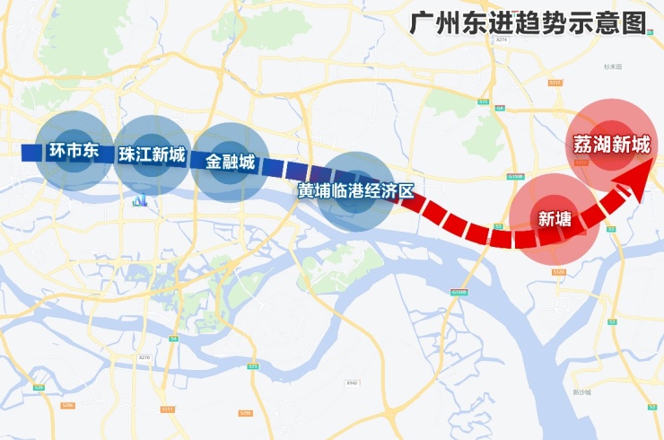 从珠江新城—金融城为核心的中轴线价值不断攀涨,再到新塘—荔湖新城为核心的东轴线区域崛起,无不证明广州东进对城市发展的非凡意义。