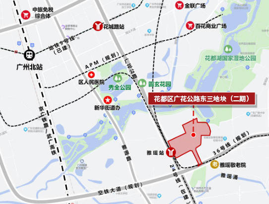 此外,地块地处地铁24号线、36号线、18号线北延线沿线,邻近广花六路、雅瑶中路, 距离东侧广东广雅中学(花都校区)0.4公里,距离花都区政府约4公里,距离广州北 站约2公里,距离白云国际机场约8公里,驾车40分钟可到达广州市区。而且,毗邻广雅中学、雅瑶小学等教育资源优质。