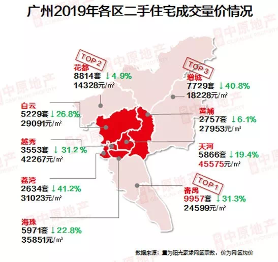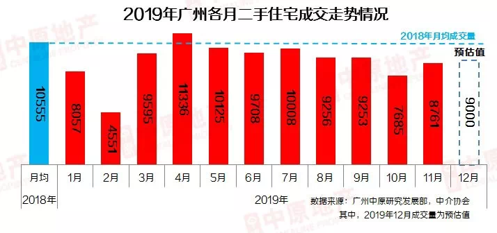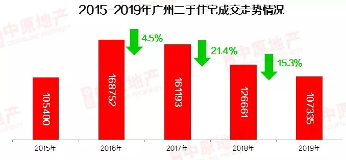 据广州中原研究发展部统计数据显示,2019年,广州市二手市场成交宗数为107335宗(1-11月来源中介协会,12月为广州中原研究发展部部监测),同比去年同期(126661宗)大幅下滑15.3%。