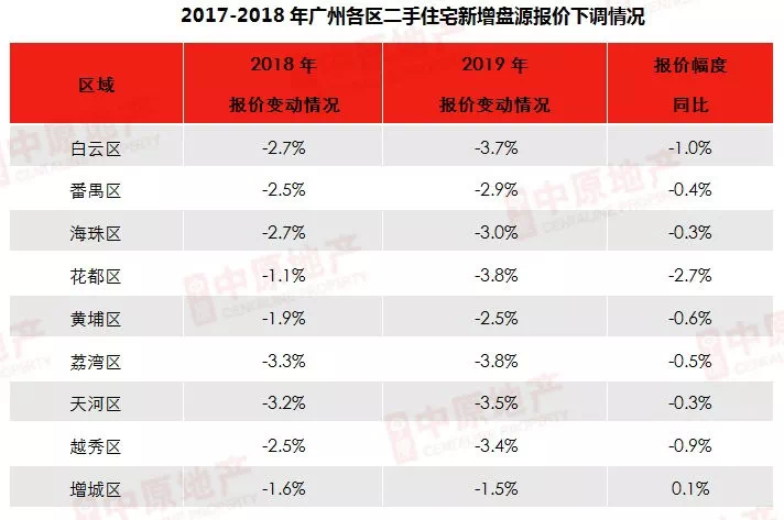 广州中原研究发展部统计数据显示,从近两年新增房源的报价情况来看,2019年报价下调房源占比基本在70%左右,其中,花都、天河、荔湾、白云等区报价下调幅度较大,基本处于3.5%以上。而番禺、海珠、黄埔等区域报价下调幅度分别为2.9%、3.0%、2.5%。