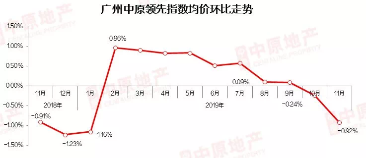 价格方面,据广州中原研究发展部统计数据显示,2019年11月,中原先进指数均价为39702元/㎡,环比下滑0.92%,跌幅再次拉大。