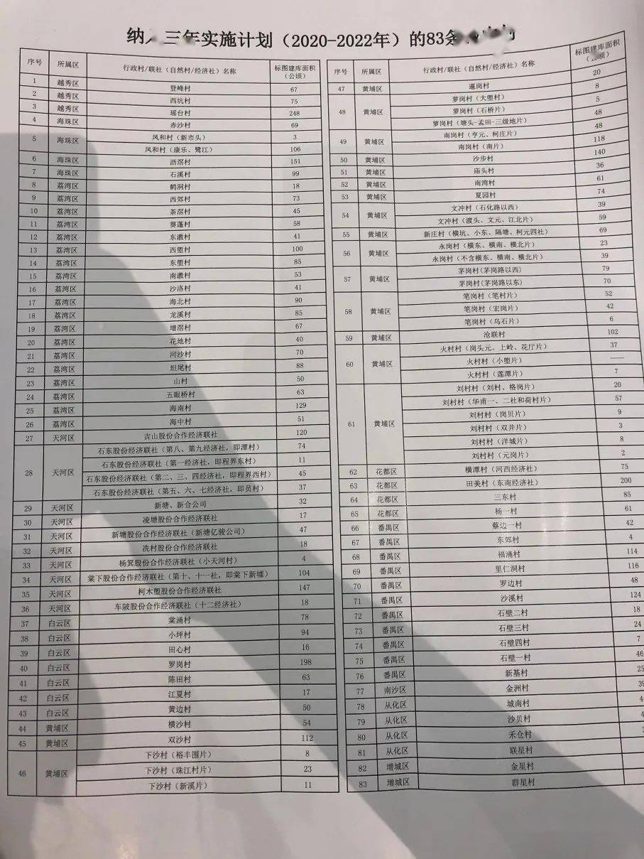 未来3年,广州将对83条城中村实施改造,覆盖荔湾区(19个)、黄埔区(18个)、番禺区(11个)、天河区(10个)、海珠区(4个)、越秀区(3个)、白云区(7个)、花都区(4个)、南沙区(1个)、从化区(4个)、增城区(2个)。