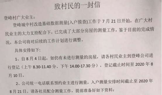 2020年7月,登峰村开始对村民房屋进行资料收集及数据测量工作。这也是时隔10年后,再一次让人看到了该旧改项目启动的可能性。