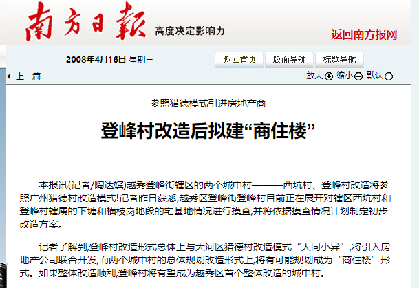 另至于登峰村未来的发展,据早期新闻报道内容显示,登峰村的改造方向定为“打造环市东智力总部区的‘休闲后花园’”,改造形式总体上与天河区猎德村改造模式“大同小异”,将引入房地产公司联合开发,并倾向采取“商住楼”的形式,即改造后的城中村建筑至少保证两个功能,一是对村民宅基地的补偿;二是建立商业地产,通过商业地产的租金保证村民的“持续分红”。