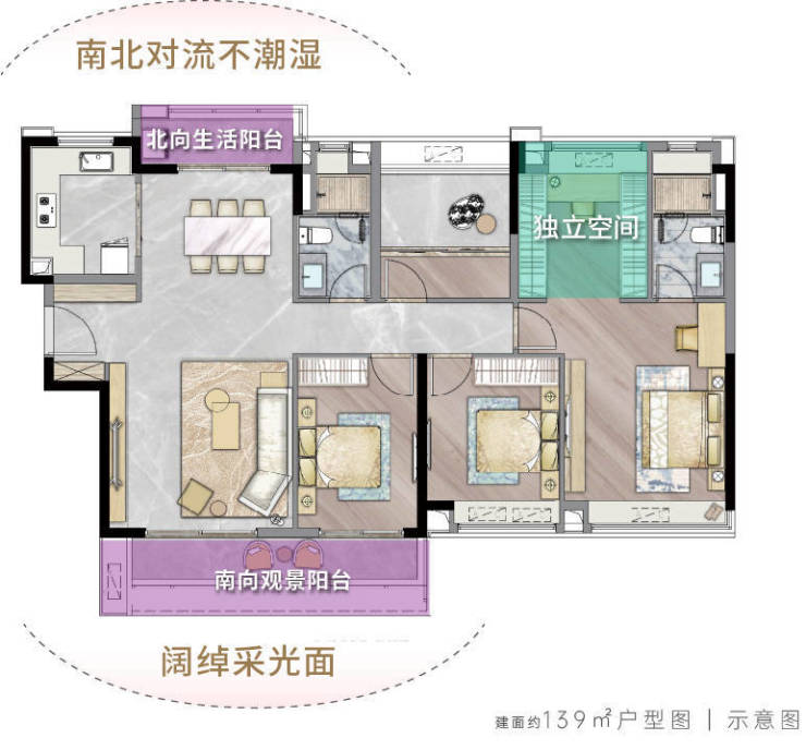 其中121㎡竖厅产品做到了南北双阳台,真正的做到南北通透全明,同时做到四开间朝南,室内通风采光能力非常强,再也不用担心回南天。