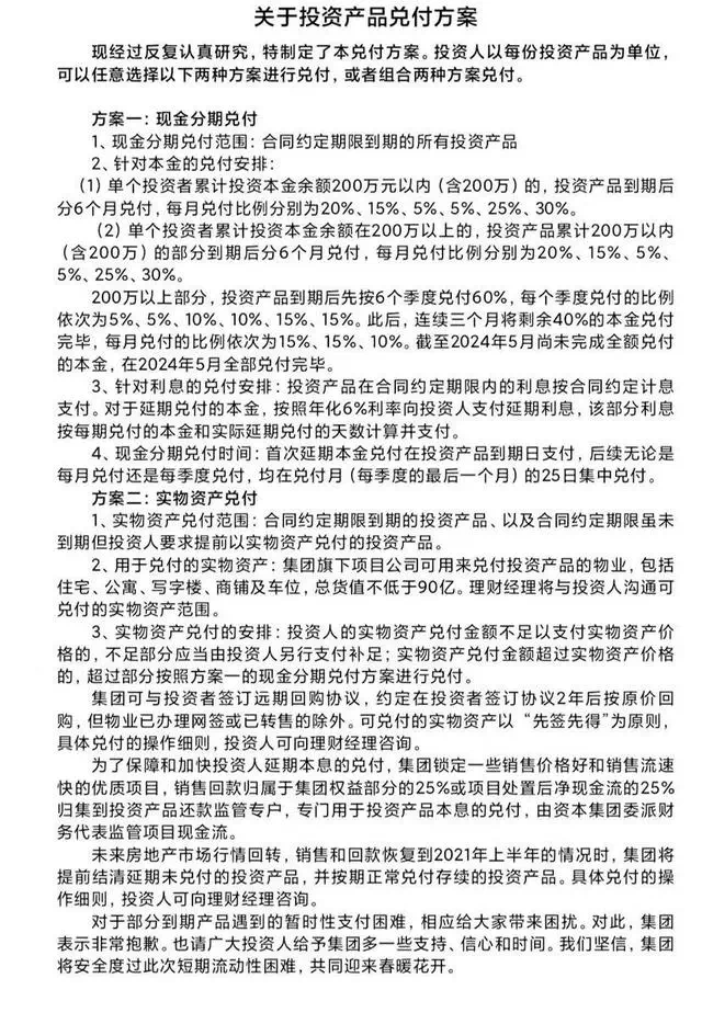 奥园透露,公司会较大限度保证投资者利益,现经过反复认真研究,制定了本次兑付方案。根据该方案,投资人以每份投资产品为单位,可以任意选择两种方案进行兑付,或者组合两种方案兑付。这两种方案分别为现金分期兑付以及实物资产兑付。