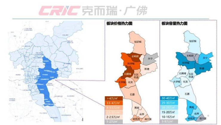 黄埔区六大板块分化明显,长岭居单价偏高、永和供应少,两板块去化压力高企;科学城、旧黄埔板块作为黄埔新老政府所在,紧邻天河,二三产业基础均好,通勤距离便捷,可作为置业首选;知识城虽为区域三大核心之一,但区位较偏,产业待发展,短期内市场下行压力较大;东区街道处于城市东进轴线,在售项目较少,目前无明显去化压力,总价可控,可重点关注;