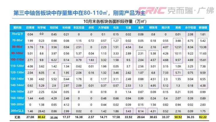 库存方面,克而瑞数据监测显示,第三中轴各板块中存量集中在80-110㎡,刚需产品为主。