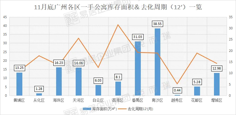 从区域库存来看,截至11月底,一手公寓库存量较大的是番禺和南沙,分别为6417套和5944套,库存面积均超30万平,但由于两者“消化能力”较强,去化周期控制在20个月内。