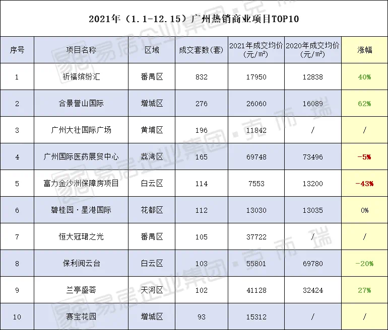 此外,今年截至12.15,广州商业项目热销TOP3分别为祈福缤纷汇、合景誉山国际及广州大壮国际广场。