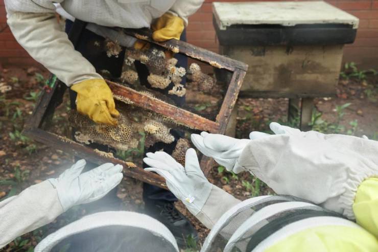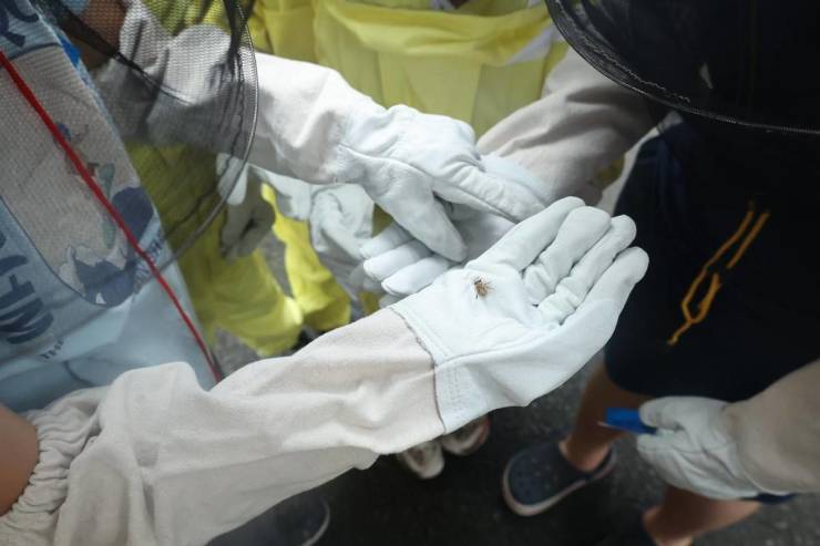 换上全副武装的防护衣,扣紧网状防护帽、戴上防蜂手套,孩子们在科普导师的协助下变身“小小养蜂人”,小心翼翼地踏入实验蜂场。当科普导师轻轻揭开蜂箱盖,一道金色的“溪流”瞬间跃入眼帘——成千上万只蜜蜂正沿着巢房脉络有序穿梭,半透明的翅膀在阳光下折射出细碎的光斑。