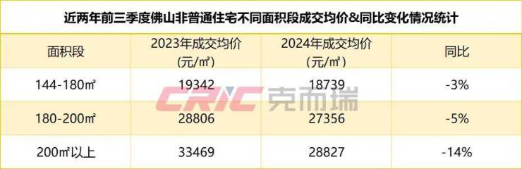 均价方面,克而瑞数据监测显示,今年前三季度佛山144-180㎡非普通住宅户型成交均价18739元/㎡,与200㎡以上户型价差达1万元/㎡。