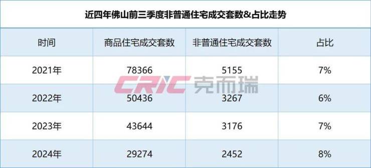 数据显示,今年前三季度佛山非普通住宅市占率8%,较去年同时期增长1%,也是近五年来同时期市占率最高的。
