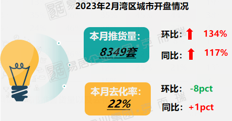 不过,从开盘去化情况看,2月湾区平均开盘去化率22%,同比基本持平,环比受上月基数结构高位影响下降8pct.