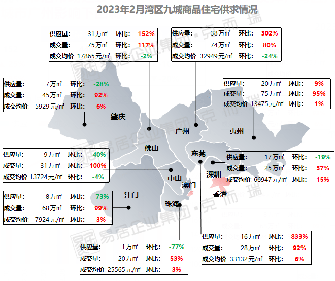 克而瑞数据统计到,2月湾区内地九城商品住宅共计供应152万㎡,环比上涨25%,同比上涨85%;成交发力拿下440万㎡,环比上涨89%,同比上涨104%。