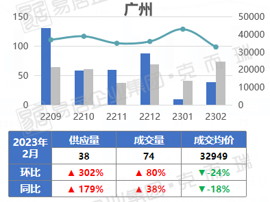 从房价角度看,居首的深圳2月成交均价为66947元/㎡,环比上涨15%;其次是东莞,2月成交均价33132元/㎡,环比上涨6%;广州位列第三,2月房价为32949元/㎡,环比下跌24%。