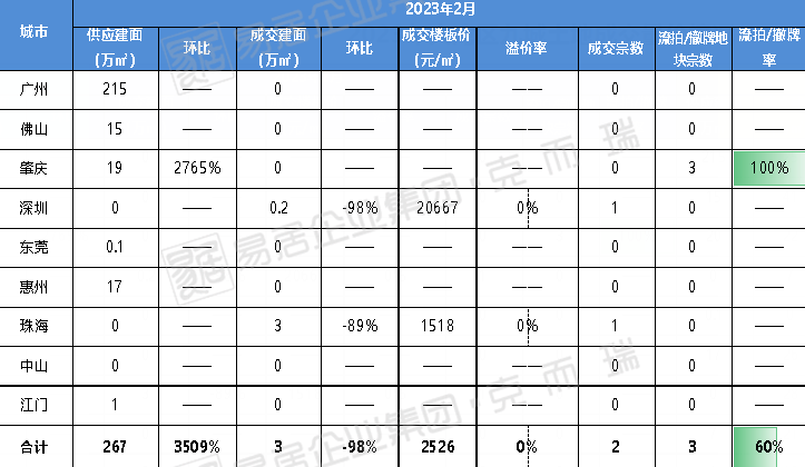 克而瑞统计到,2月湾区内地九城经营性用地合计供应267万方,环比大增3509%。