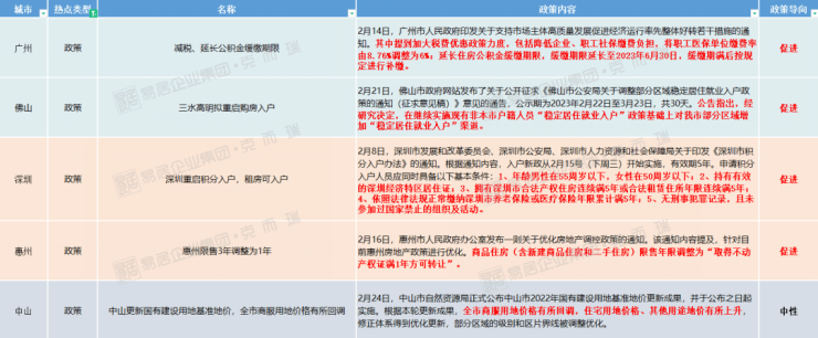 先看政策出台情况。据克而瑞不完全统计,2月湾区内地9城中,共计5城出台房地产相关政策,包括广州减税、延长公积金缓缴期限,佛山部分区域拟重启购房入户,深圳重启积分入户、租房可入户,惠州调整限售年限等。