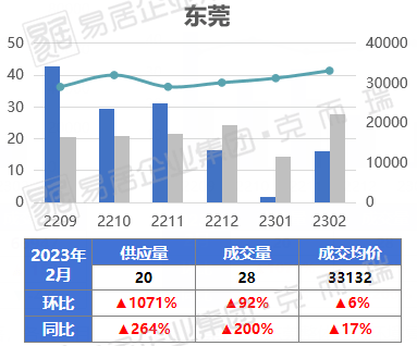 东莞:2月东莞整体经济环境复苏明显,随着人员回流,前期受疫情和春节影响受抑需求得以释放,东莞楼市明显回暖,供求量价同环比上升明显,成交规模恢复至2021年春季,楼市进入下行周期前的水平。